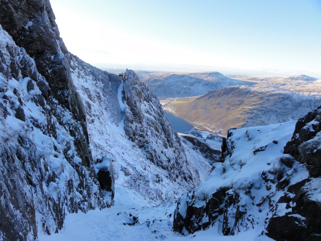 Cam Spout, on the far side below Broad Stand and Mickledore and leading to the ridge is just a twist of frozen green ice.