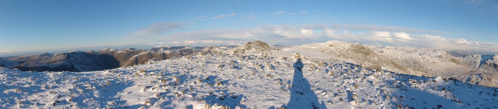Lunchtime on the highest spot in England also meant that it would be dark in a few hours. My way back was over Scafell to the west, and I could make out a snow filled Lord’s Rake below. In the picture you can see the diagonal white strip to the right of the mountain mass.