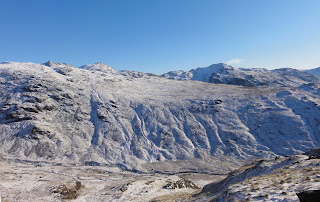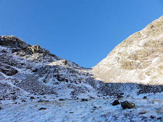 This route to Scafell is one of the best. Long. A long trek in through the varying scenary of upper Eskdale. Now the faint paths are obcured by snow and frost, and the wide boggy area of the Great Moss is comfortably and firmly frozen.