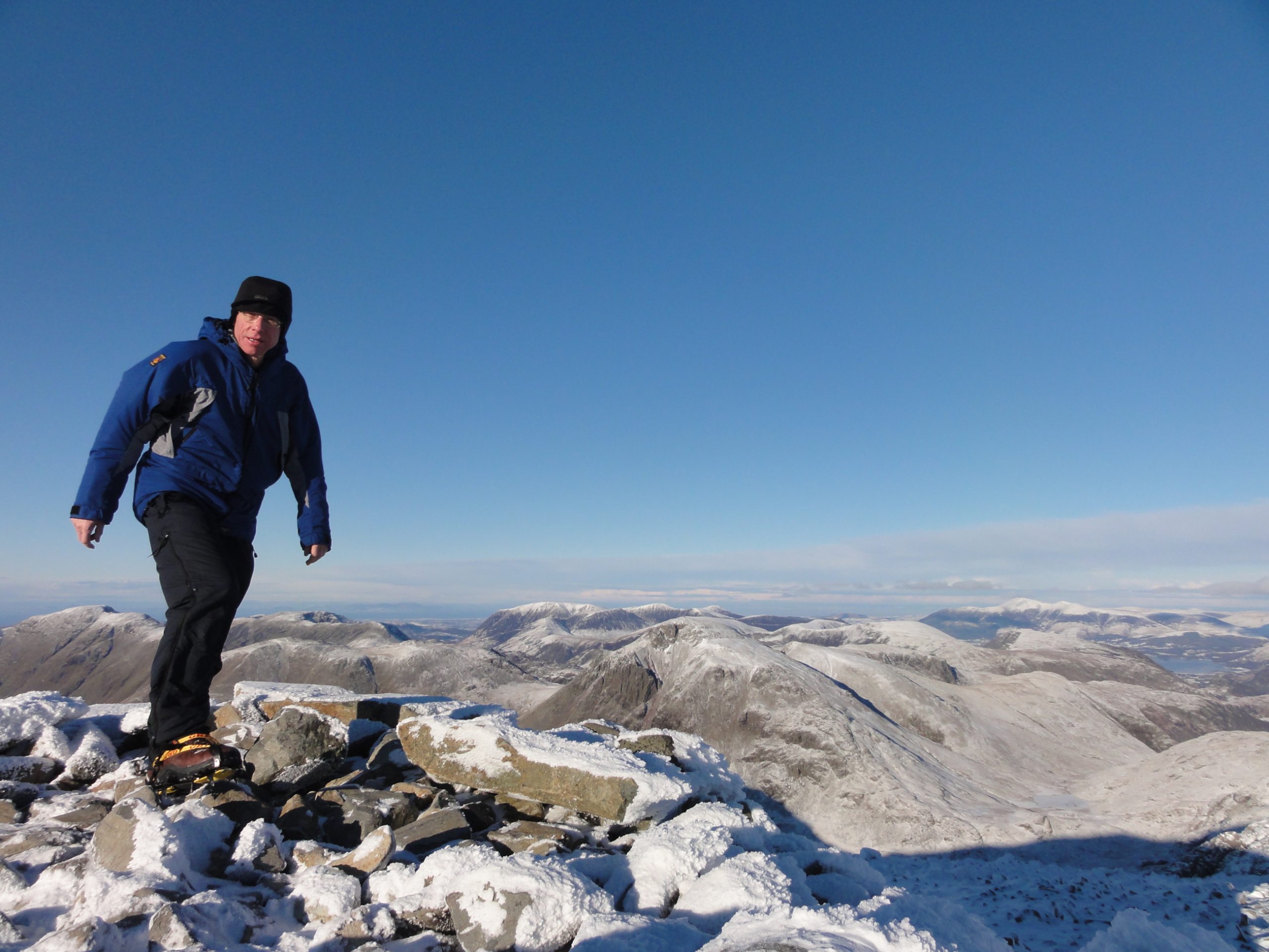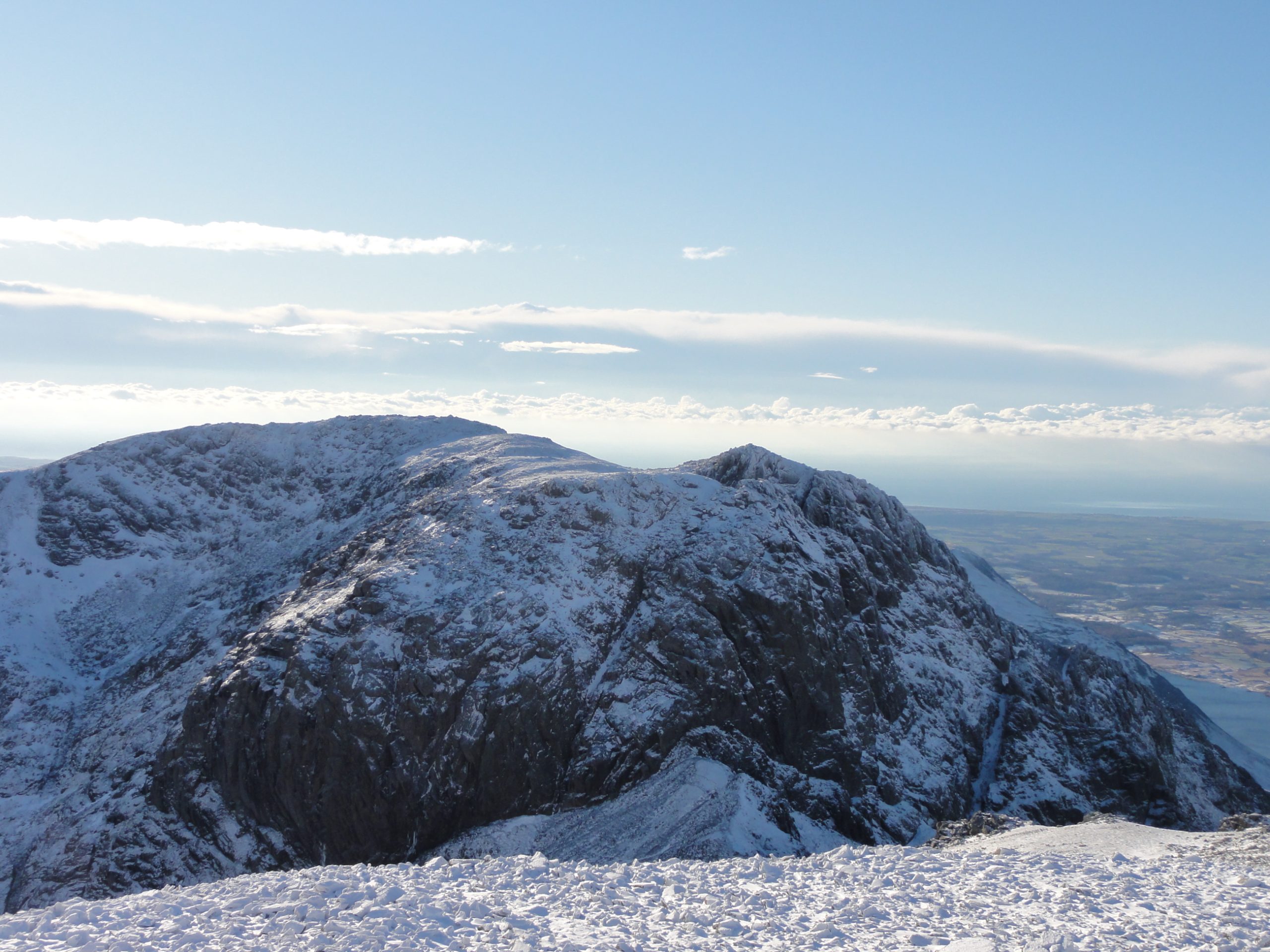 Lunchtime on the highest spot in England also meant that it would be dark in a few hours. My way back was over Scafell to the west, and I could make out a snow filled Lord’s Rake below. In the picture you can see the diagonal white strip to the right of the mountain mass.