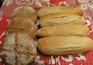 The loaves on the left are 80% strong wheat wholemeal with about 15% strong white wheat flour and a small part of rye. Although the dough rises well during preparation at the last minute it has a tendency to collapse. Whereas the white on the right keeps its volume.