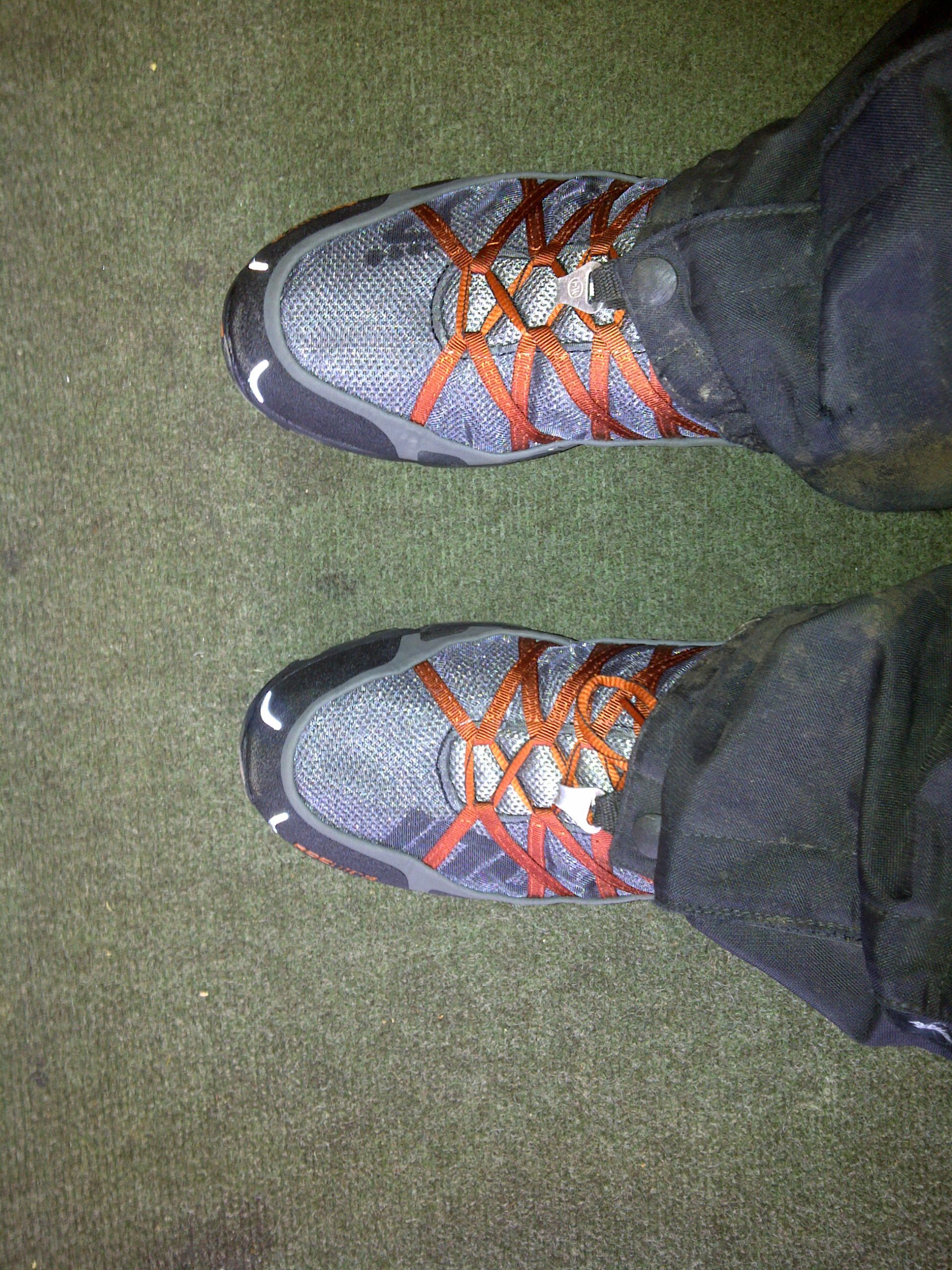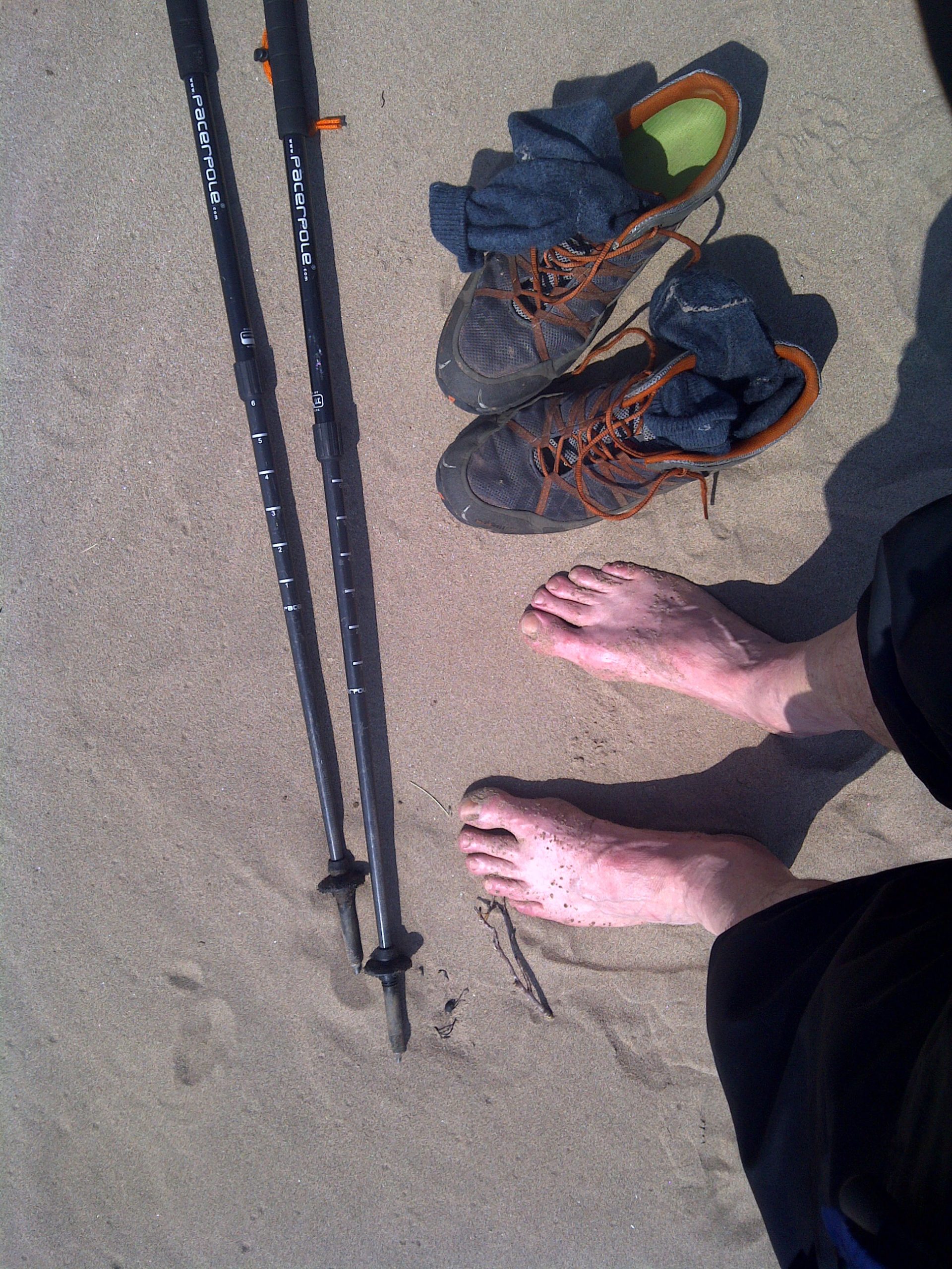 2. O rivers! Bloated streams! Raging torrents! You probably remember the routine Alan when you wore leathern boots – 30 min to go through the process – sort out the positioning, psych-up to doing it, then decommission the gaiters, remove the boots with their special lacing system, the socks and on with those never changing Crocs, stow the gaiters and socks, tie the boots together, attach somewhere (for me around the neck), then tentatively shuffle while facing upstream and leaning into the flow and feeling for foot places with walking poles. Then, assuming a safe crossing, drying off and replacing Crocs with boots.