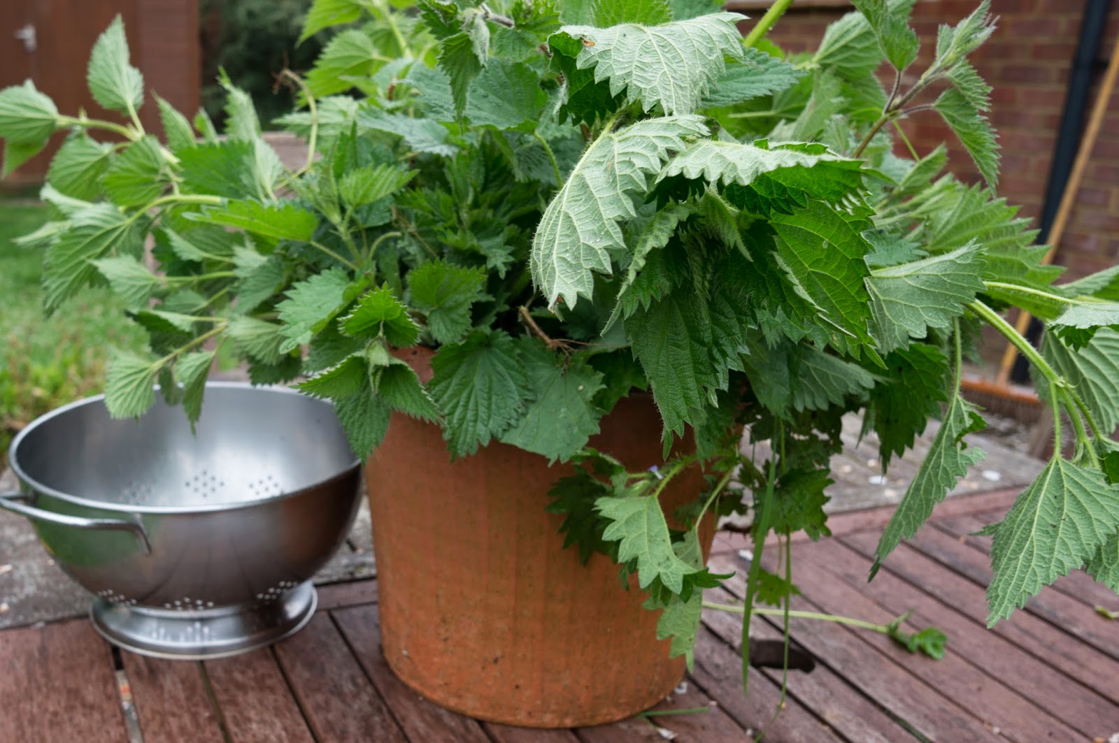 The trick in handling is to use gloves of course . Picking nettles in April – any will do. The big bunch in the picture came from one corner of the garden and yielded around 400 grams of leaves.
