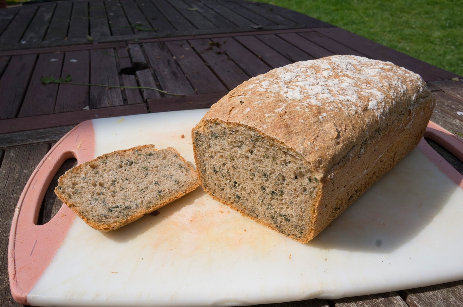 The leaves turn dark in the baked loaf and the flavour is not very pronounced. The loaf above has about 220gm of leaf, probably too little.