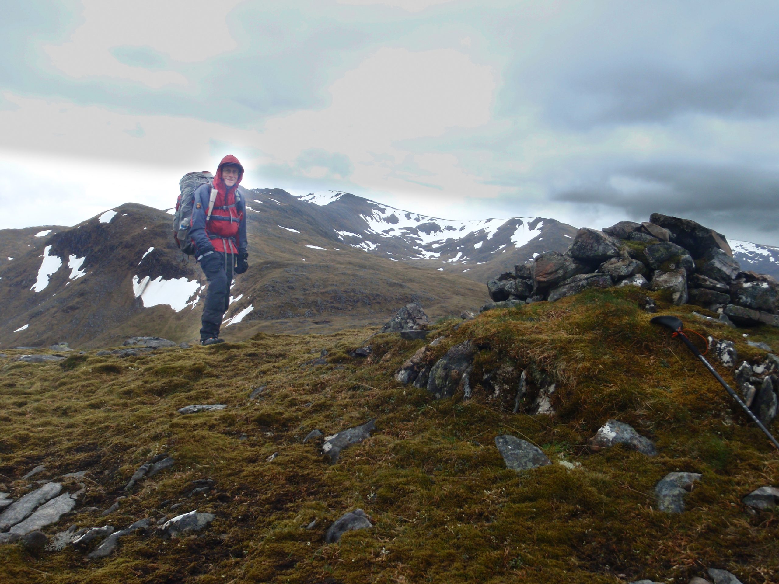 Hail and low cloud now limit visibility but on the narrow ridge there is only one way to go, and fortunately there is little or no wind to make the airy start to this path treacherous. Now it is after 16:00 and although I have only just reached the main objective of the day, I was already thinking about where I might camp for the night. On the map there is no obvious spot for a high camp, and without great visibility the ridge ahead did not look so welcoming. I resolved to take the first escape route down towards the youth hostel at Alltbeithe.
