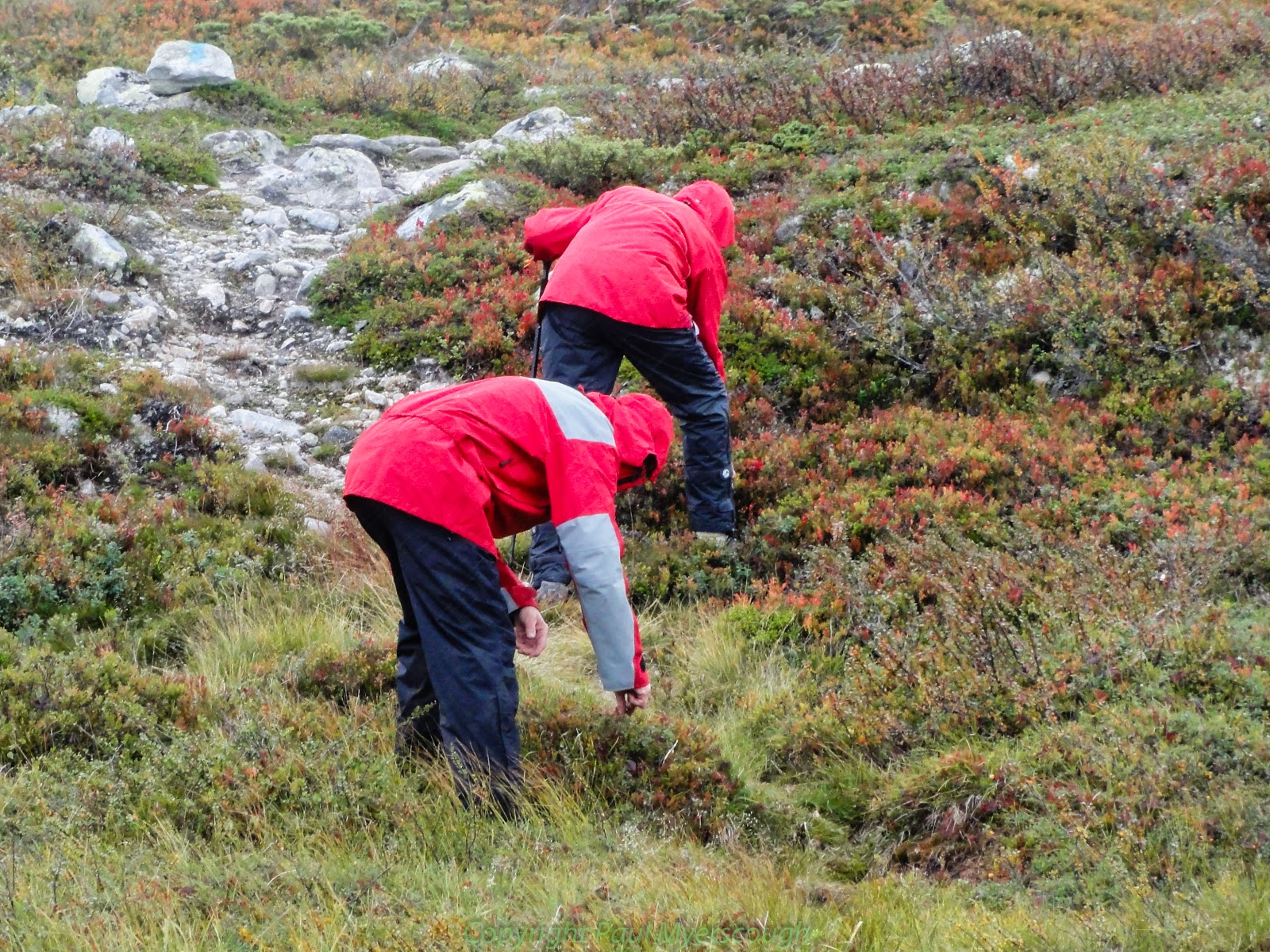 Heading down to avoid the forecasted deterioration in the weather we came upon a small patch of Molte or cloudberries (Rubus chamaemorus). This fruit is regarded as a great delicacy. With a subtle taste it is often prepared with whipped cream and sugar. It is relatively rare and so its whereabouts are often kept secret. The picking season is earlier in August and these specimens were past their best and not worth gathering.