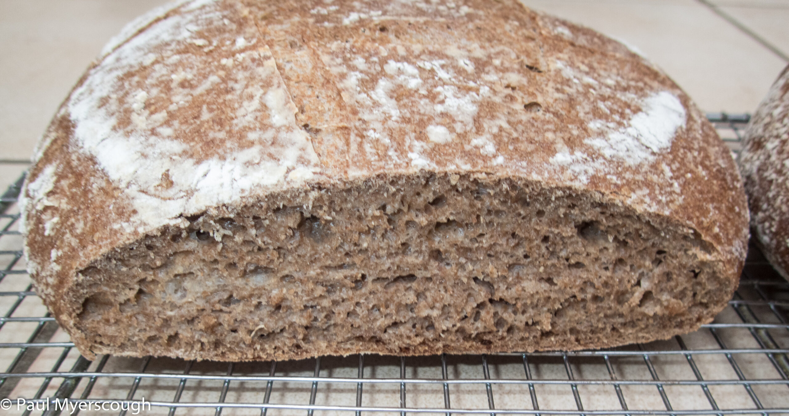 I was pleased with the results. I used 100% stone-ground strong wheat flour for the brown loaves, and an 80-20 mix of stone-ground flour white & whole for the white loaves. You can see the crumb in the pictures below; the texture pleasantly chewy making a good sandwich and excellent toast!